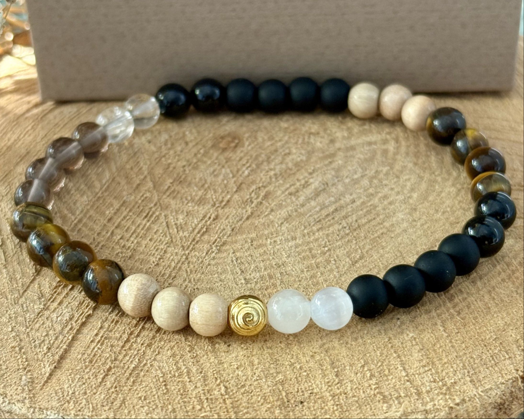 Dieses Armband verbindet dunkle Edelsteine mit naturfarbenen Holzperlen. Es gibt dir Halt, Mut und die Kraft, dich klar auszurichten.