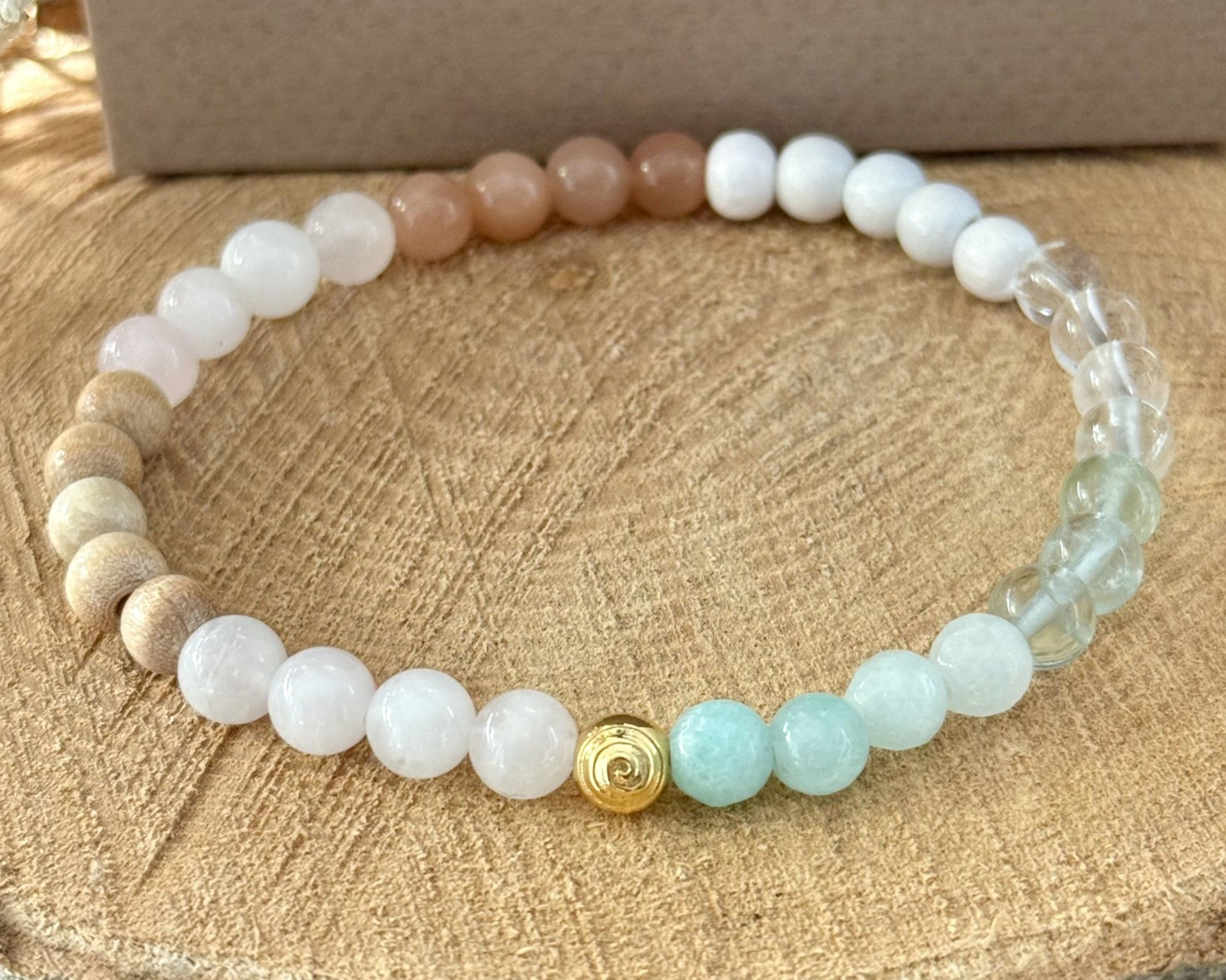 Dieses Armband vereint kraftvolle Halbedelsteine mit weißen und naturfarbenen Holzperlen. Es öffnet dein Herz, stärkt deine Intuition und schenkt dir innere Klarheit.